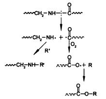 高分子聚合物成分通過對紫外線的吸收,處于高能量的光激發(fā)態(tài)(P*),經(jīng)過鍵裂,產(chǎn)生自由基(P·);自由基與O2經(jīng)過鏈增長反應(自動氧化作用),導致聚合物降解。過氧化氫(POOH)和過氧化物(POOP)經(jīng)過光引發(fā)的氧化作用后,所產(chǎn)生的產(chǎn)物不穩(wěn)定,他們在光的照射和適度加熱的條件下離解生成烷氧基(PO·)和羥基(HO·)自由基,因此降解反應是在自動催化下完成。這些自由基的活性很高,非常容易奪取氫原子,生成聚合物自由基(P·),進入聚合物降解的鏈傳遞階段。叔烷氧自由基離解成酮類和較低分子量聚合物自由基(P'·),使聚合物裂解;引起氧化降解的鏈傳遞是一個通過自動催化作用,奪取聚合物中的氫原子。