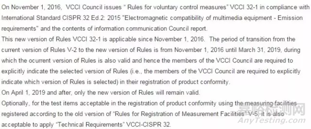2016年11月1日,VCCI根據(jù)國際標(biāo)準(zhǔn)CISPR32 Ed2:2015(多媒體設(shè)備電磁兼容性-發(fā)射要求)頒布了標(biāo)準(zhǔn)VCCI 32-1“ Rules for voluntary control measures”,取代現(xiàn)行版本V-2,該規(guī)則即日起生效,過渡期由2016年11月1日至2019年3月31日。在過渡期間,兩份標(biāo)準(zhǔn)可以擇一使用,2019年4月1日起新標(biāo)準(zhǔn)開始強制執(zhí)行。按照老標(biāo)準(zhǔn)申請的授權(quán)實驗室仍適用于新標(biāo)準(zhǔn)。原文如下: