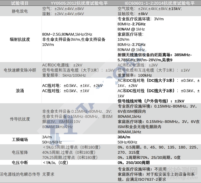 在中國(guó),目前實(shí)施的YY 0505:2012標(biāo)準(zhǔn),鑒于國(guó)內(nèi)有很多的產(chǎn)品,既有國(guó)內(nèi)的注冊(cè),也需要在歐美注冊(cè),所以需要了解這2個(gè)標(biāo)準(zhǔn)的差異。抗擾度項(xiàng)目差異較大,故將抗擾度項(xiàng)目的標(biāo)準(zhǔn)做一個(gè)差異對(duì)比表,以方便查閱。