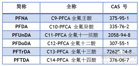 分子式為CnF2n+1-C(=O)OH的直鏈和支鏈全氟羧酸,其中n=8,9,10,11,12或13(即C9-C14 PFCAs),包括其鹽類和任何組合;