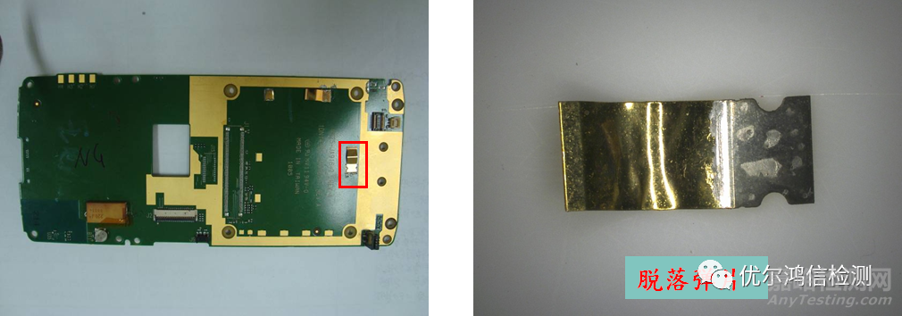 ·客戶產(chǎn)品出現(xiàn)鍍金彈片焊接后輕撥即會(huì)脫落,不良率約為100%,客戶要求分析失效原因。 ·失效彈片基材為鈹銅,表面處理為化鎳浸金,PCB為化鎳浸金板。 |