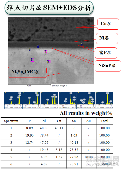 NG樣品斷裂面位于Cu層與IMC層之間。 NG樣品鍍Ni層厚度僅為0.30μm左右,在焊接過(guò)程中已全部消耗完畢。鍍Ni層過(guò)薄可能是導(dǎo)致焊點(diǎn)脫落的主要原因。 一次改善后的Ni層厚度增加至0.60μm左右,在焊接過(guò)程中仍然消耗完畢。 二次改善后的Ni層厚度增加至1.40μm左右,在焊接后有殘余。焊點(diǎn)強(qiáng)度有明顯改善,但鍍層中P含量偏高(12wt.%左右),焊接后易生成Ni-Sn-P相,而Ni-Sn-P相與IMC結(jié)合力差,可能對(duì)焊接強(qiáng)度有影響。 |