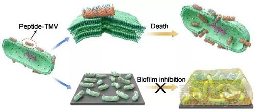 多肽功能化煙草花葉病毒抗革蘭氏陰性菌及抑制生物膜形成示意圖