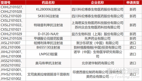 四川科倫的KL280006注射液(2個規(guī)格)和SKB336注射液、上海君實/蘇州眾合的特瑞普利單抗注射液(3個規(guī)格)、益方生物的D-0120-NA片、先聲藥業(yè)的甲磺酸侖伐替尼膠囊、默沙東的帕博利珠單抗注射液、勃林格殷格翰的BI655130注射液、諾華的LNP023膠囊(2個規(guī)格)。