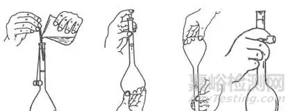 將容量瓶盛水后塞好,左手按緊瓶塞,右手托起瓶底使瓶倒立,如,不漏水方可使用。瓶塞應(yīng)用細(xì)繩系于瓶頸,不可隨便放置以免沾污或錯(cuò)亂,啟塞后,應(yīng)按圖進(jìn)行操作。