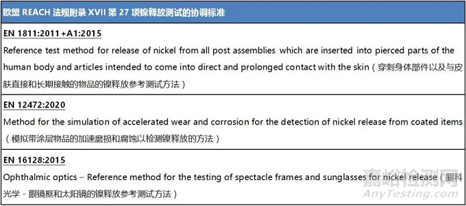 從2021年4月20日起,用于證明符合REACH法規(guī)附錄XVII第27項鎳釋放要求的測試標(biāo)準(zhǔn)清單將為如下:
