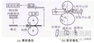 異步疊軋技術(shù)(AARB)是在累積疊軋技術(shù)的基礎(chǔ)上衍生出來的。它的出現(xiàn)降低了軋制力,增大了變形量,提高了產(chǎn)品的表面質(zhì)量。異步疊軋過程與累積疊軋過程基本相同,而軋輥存在大小差異。導(dǎo)致了中性面偏向快速輥一側(cè), 使材料的幾何中心層與實際中心層不重合。異步疊軋技術(shù)具有累積疊軋技術(shù)不具有的優(yōu)勢,但也有累積疊軋技術(shù)的不足之處。