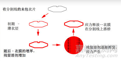 橋接現(xiàn)象主要發(fā)生在刻字片上,使得包衣片標志模糊,如圖5所示。橋接機理如圖6所示,未包衣的片芯具有明顯標識,隨著包衣過程衣膜的增厚,殘留溶劑增加,緊接著殘留溶劑揮發(fā)產(chǎn)生應力,在應力釋放過程中,導致衣膜在在標識上搭橋。橋接的產(chǎn)生可能是由于低粘附性的片芯成分、不合適的標識設計、低粘附性的包衣材料、設備噴霧速率太高等原因,因而可選擇高附著力的片芯成分以及包衣材料,并優(yōu)化標識設計,包衣過程中可降低噴霧速率。