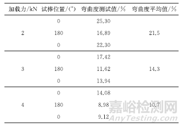 根據(jù)美標(biāo)ASTM E1012—2014,按柱狀標(biāo)準(zhǔn)試樣棒的計(jì)算公式計(jì)算出了中間一層應(yīng)變片的數(shù)據(jù),見(jiàn)表2??梢?jiàn)得到的最小的彎曲度數(shù)據(jù)為10.7%,在加載力為4kN(機(jī)器50kN的8%載荷點(diǎn))時(shí)得到。