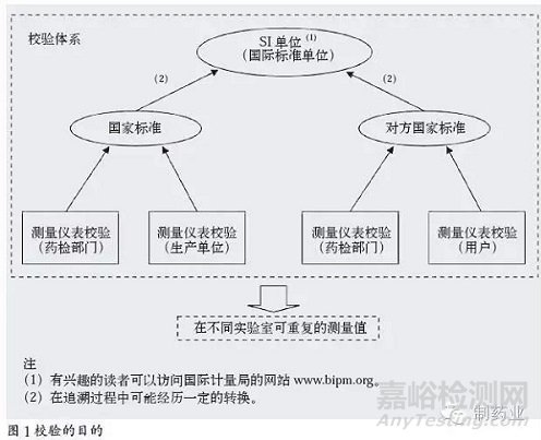 校驗(yàn)的目的,是為了保證測(cè)量值能夠溯源到國(guó)家標(biāo)準(zhǔn),最后溯源到SI單位(見圖1)。這是為了保證國(guó)際貿(mào)易、法規(guī)管理和技術(shù)交流中數(shù)據(jù)的準(zhǔn)確性和統(tǒng)一性。例如,客戶所在國(guó)家的藥典規(guī)定某個(gè)藥品的HPLC純度不低于98.0%;公司自己測(cè)出來(lái)有98.5%。那么,如何保證公司的測(cè)量值與客戶的測(cè)量值一致?最基本的工作就是對(duì)HPLC進(jìn)行校驗(yàn)。