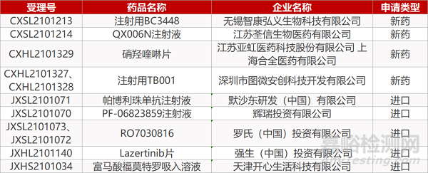 無錫智康弘義生物的注射用BC3448、江蘇荃信生物的QX006N注射液、江蘇亞虹醫(yī)藥、上海合全的硝羥喹啉片、深圳市圖微安創(chuàng)科技的注射用TB001(2個規(guī)格)、默沙東的帕博利珠單抗注射液、輝瑞的PF-06823859注射液、羅氏的RO7030816(2個規(guī)格)、強生的Lazertinib片。