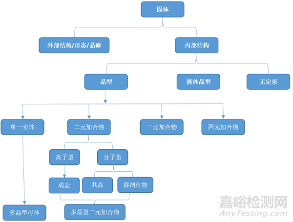 藥用固體可按如下圖大致分類。離子型加合物是由陰離子以及陽(yáng)離子組成,也稱之為鹽。分子型加合物一般由中性分子所組成,可分為溶劑化物或共晶物,是由所加入分子的物理狀態(tài)所決定的。