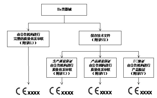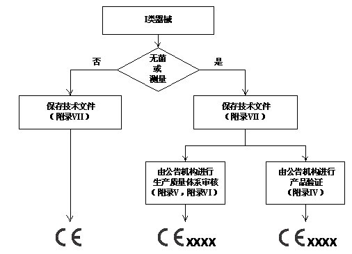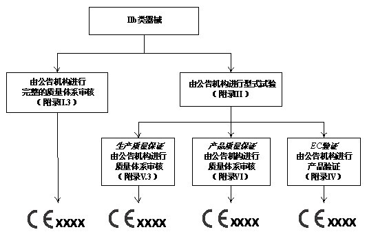 所有器械通過(guò)醫(yī)療器械指令(MDD)附錄IX的分類規(guī)則被劃分為四個(gè)管理類別:I類,IIa類,IIb類和III類。醫(yī)療器械指令(MDD)對(duì)每個(gè)管理類別內(nèi)的器械規(guī)定了相應(yīng)的合格評(píng)定程序。制造商應(yīng)該根據(jù)附錄中的判斷規(guī)則判斷器械屬于哪一類別。醫(yī)療器械指令對(duì)各類器械合格評(píng)定程序的要求如以下四圖所示,詳細(xì)規(guī)定可參見(jiàn)附錄II~VII。