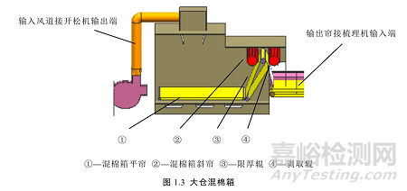 大倉混棉是相對于部分將兩種或兩種以上的纖維混合制氈的工藝而言的重要工序,主要是完成各種纖維原料的混合、開松、儲備等功能,要求在減少對纖維損傷的同時,又要使混合纖維達到均勻的絮狀,并完成纖維原料的輸送和均勻喂入。設(shè)備為大倉混棉箱。