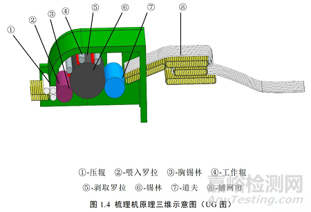 梳理的原理:經(jīng)大倉混棉后的纖維,由平簾輸送至梳理機喂入羅拉處,經(jīng)羅拉喂入工作錫林,工作錫林上安裝有工作輥與剝?nèi)×_拉(剝?nèi)≥?mdash;—同復(fù)雜形式的開松機),兩者的綜合作用,能將纖維進行進一步打亂、分散,形成分散性較高的纖維層,最后經(jīng)道夫輸送至網(wǎng)簾至下一步成網(wǎng)工序。