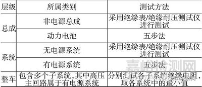 依據(jù)絕緣電阻的分類,絕緣電阻的測(cè)試包括總成級(jí)測(cè)試、系統(tǒng)級(jí)測(cè)試與整車級(jí)測(cè)試。