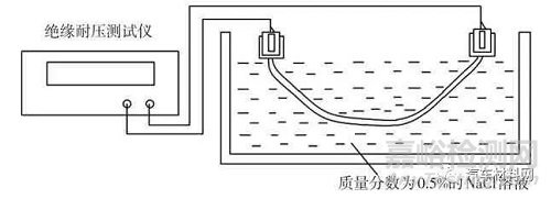高壓電線束測(cè)試中,因?yàn)槠洳痪哂薪饘偻鈿ぃ瑹o法找到高壓測(cè)試點(diǎn)外的另一個(gè)有效的測(cè)試點(diǎn),因此將高壓電線束的絕緣層部分浸入導(dǎo)電溶液。將導(dǎo)電溶液作為另一個(gè)測(cè)量點(diǎn),如圖6所示[5]。使用絕緣測(cè)試設(shè)備測(cè)試彼此連接的端子與線束外表面間的絕緣電阻。