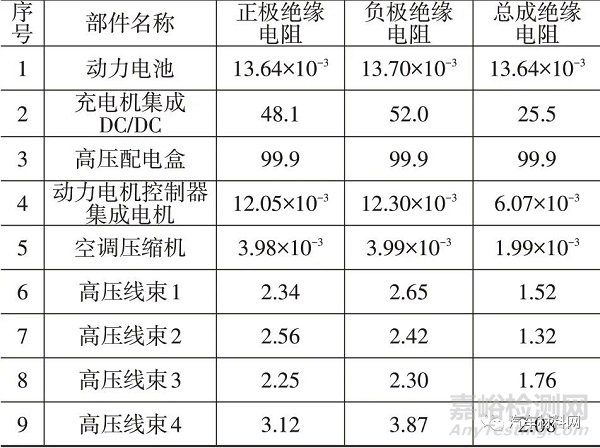 表4 系統(tǒng)中所有總成的絕緣電阻測(cè)試結(jié)果 GΩ