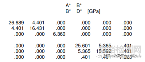 從中我們可以看出,當(dāng)0度層數(shù)多于90度層數(shù)時(shí),A11(26.689 GPa)要比A22(16.431 GPa)大得多;當(dāng)A16 = A26 = 0時(shí),層合板在平面內(nèi)平衡,+45度層和-45度層的比例相等;當(dāng)拉伸/彎曲耦合剛度矩陣[B] = 0時(shí),層合板具有背板對(duì)稱性。還要注意的是,彎曲剛度矩陣[D]的大小與平面內(nèi)剛度矩陣[A]相似,并且在彎曲時(shí)層壓板只會(huì)輕微扭曲,因?yàn)镈16=D26=0.401 GPa與D11=25.601 GPa相比較小。