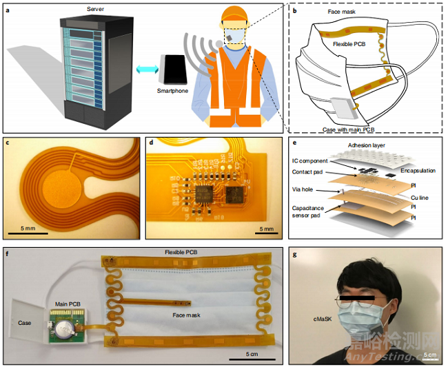 下圖顯示了本研究的總體概念。cMaSK可以很容易地連接到各種面罩上,并且可以收集環(huán)境和生物信號。收集的數(shù)據(jù)通過藍牙通信傳輸?shù)蕉ㄖ频囊苿討贸绦?,并發(fā)送到服務器進行數(shù)據(jù)存儲和管理。設計cMaSK時的四個要求:(1)應選擇合適的傳感器組件并將其放置在最佳位置;(2)cMaSK不應妨礙呼吸或影響面罩的佩戴和防護質(zhì)量;(3)cMaSK應多次可逆地粘附在面罩上或從面罩上分離;(4)整個系統(tǒng)必須具有機械耐久性。