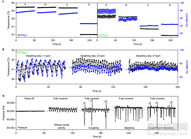 當cMaSK未正確佩戴時,呼吸引起的波動變得更弱,甚至消失(下圖)。傳感器表征結(jié)果驗證了cMaSK可以基于這些多模態(tài)信號對面罩的佩戴位置進行分類。此外,通過計算溫度、濕度和氣壓的波動次數(shù),可以高精度地識別呼吸頻率,甚至可以在說話時檢測咳嗽。因此,研究團隊驗證了cMaSK可以監(jiān)測與傳染病相關的關鍵生物信號,如呼吸頻率、咳嗽和皮膚溫度。