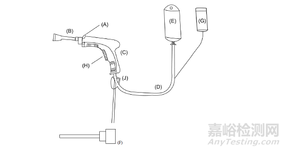 目前,沖洗器一般由噴管(如:淋浴狀噴管,刷狀噴管等)、槍體(含鎖環(huán)和扳機(jī))、進(jìn)液管、電源盒和吸引管等組成。典型的產(chǎn)品結(jié)構(gòu)一般包括A鎖環(huán)、B淋浴狀噴管、C槍體、D進(jìn)液管、E袋裝沖洗藥液(生理鹽水等,非系統(tǒng)的構(gòu)件)、F刷狀噴管、G電源盒、H扳機(jī)、J吸引管等部件。產(chǎn)品結(jié)構(gòu)參考示意圖見(jiàn)圖1。(說(shuō)明:產(chǎn)品因電源內(nèi)置或使用網(wǎng)電源等及其他結(jié)構(gòu)性差異,與圖示情形可能不完全一致)