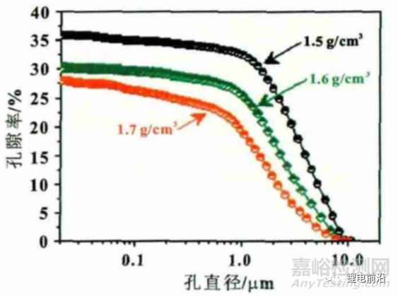 (3)工藝參數(shù) 從工藝參數(shù)方面看,壓實密度對石墨陽極影響較大,極片冷壓過程中,石墨陽極膜層中產(chǎn)生較大的壓應力,這種應力在極片后續(xù)高溫烘烤等工序很難完全釋放。電芯進行循環(huán)充放電時,由于鋰離子的嵌入和脫出、電解液對粘接劑溶脹等多個因素共同作用,膜片應力在循環(huán)過程得到釋放,膨脹率增大。另一方面,壓實密度大小決定了陽極膜層空隙容量大小,膜層中孔隙容量大,可以有效吸收極片膨脹的體積,空隙容量小,當極片膨脹時,沒有足夠的空間吸收膨脹所產(chǎn)生的體積,此時,膨脹只能向膜層外部膨脹,表現(xiàn)為陽極片的體積膨脹。