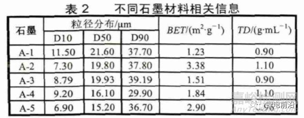 采用5種不同類型的石墨進行實驗(見表2),涂布質(zhì)量0.165g/1,540.25mm2,壓實密度1.6g/cm3,銅箔厚度8μm,其他條件相同,實驗結(jié)果如圖7所示。從圖7(a)可以看出,不同石墨在X/Y方向膨脹率差異較大,最小0.27%,最大1.14%,Z方向膨脹率最小15.44%, 最大17.47%, X/Y方向膨脹大的,在Z方向膨脹小,同2.2節(jié)分析的結(jié)果一致。其中采用A-1石墨的電芯出現(xiàn)嚴重變形,變形比率20%,其他各組電芯未出現(xiàn)變形,說明X/Y膨脹率大小對電芯變形有顯著影響。