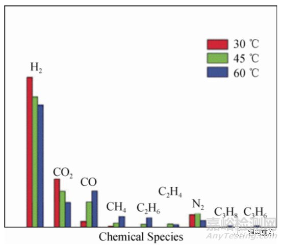 圖8 Li4Ti5O12/LiMn2O4電池在 30、45、60 ℃循環(huán) 5 個月的氣體成分
