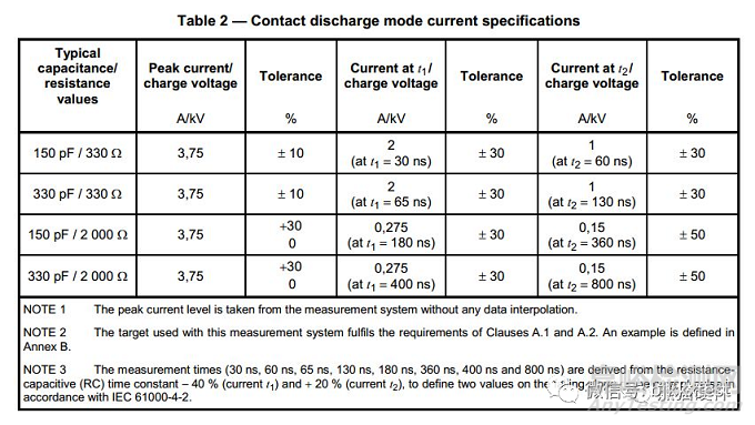 靜電放電電流波形的規(guī)定,主要的四個關鍵指標為:首次峰值電流Ip;上升時間Tr;30ns時的電流值I30;60ns時的電流值I60。從上表中可以看出這四個指標的容許偏差都較大,首次峰值電流Ip為±15%,上升時間Tr為±25%,30ns時的電流值I30為±30%,60ns時的電流值I60為±30%。