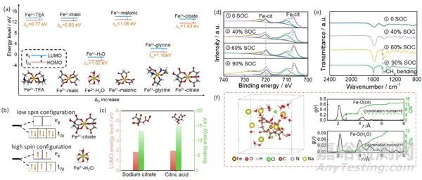 圖1 (a-c) 配體量子化學計算篩選;(d-e) XPS與FTIR分析;(f) Fe2+-citrate絡合物溶劑化結(jié)構(gòu)DFT-MD計算