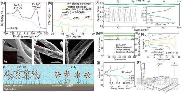 圖2 (a-b) 鐵沉積界面成分分析;(c-e) 不同配體作用下鐵沉積形貌;(f) 配體引入前后鐵沉積過程機理示意圖;(g-k) 電池性能綜合評測