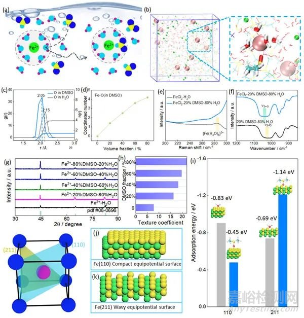 圖3 (a) DMSO改變Fe2+溶劑化殼層的過程示意圖;(b-d) 分子動力學模型與徑向分布函數(shù)圖;(e-f) 鐵負極溶液光譜分析;(g-h) 晶體結(jié)構(gòu)分析與表征;(i-k) 不同晶面吸附能計算結(jié)果