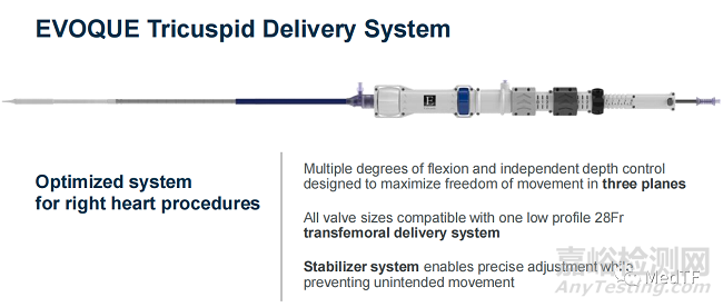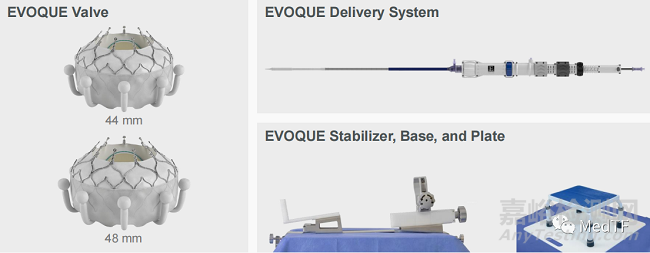 Evoque是一款自膨脹式三尖瓣瓣膜,由自膨式鎳鈦合金支架、牛心包瓣葉、編織物裙邊以及瓣葉夾持裝置組成,具有 44 和 48 mm 兩種尺寸型號;