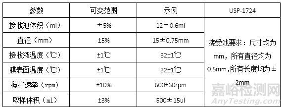 USP<725> TOPICAL AND TRANSDERMAL DRUG PRODUCTS—PRODUCT PERFORMANCE TESTS(局部和透皮藥物產(chǎn)品-產(chǎn)品性能測(cè)定,USP,2009年),提出了設(shè)備關(guān)鍵參數(shù)種類及可接受范圍。