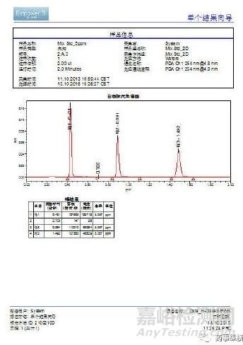 報(bào)告模板內(nèi)容主要包括五個(gè)板塊:頁(yè)眉、信息欄、色譜圖、峰表、頁(yè)腳。以下面的圖譜為例說(shuō)明: