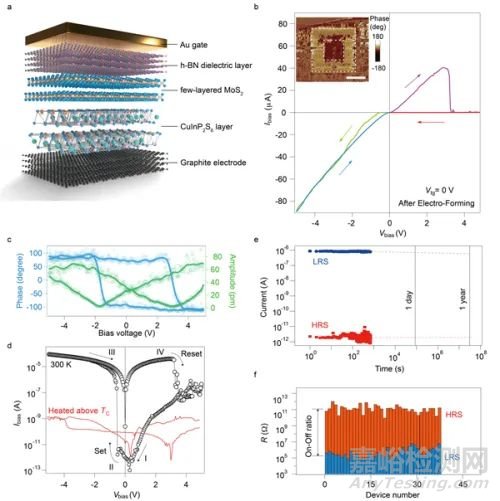 圖1.器件結(jié)構(gòu)設(shè)計及兩端鐵電憶阻器的存儲性能。a、器件結(jié)構(gòu)示意圖;b、器件的阻變行為;c、少層CuInP2S6的壓電力顯微鏡相位和幅值圖;d、器件在不同溫度下的輸運(yùn)行為;e、存儲器的數(shù)據(jù)保持能力測試;f、存儲器開關(guān)比統(tǒng)計圖。