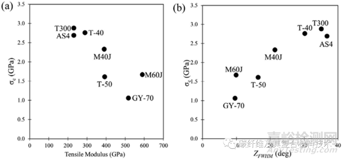 在圖3a中也顯示一組商用碳纖維的壓縮強(qiáng)度和拉伸模量的反比關(guān)系。此外,圖3b結(jié)果顯示,對于相同的纖維,高度的微觀結(jié)構(gòu)取向(如較低的方位角Z FWHM)可使得碳纖維產(chǎn)生較低的壓縮強(qiáng)度,而較高的晶粒排列也對提高抗壓強(qiáng)度無益。