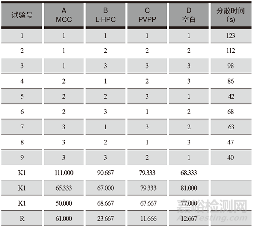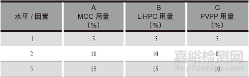 從正交試驗結(jié)果和方差分析可以得知:各因素、水平之間無顯著差異,影響最大的因素為A,即MCC,其次為L-HPC,再次為PVPP;影響因素的主次順序為A>B>C;最佳輔料用量為A3B2C3,即MCC用量為?15%,L-HPC?用量為10%,PVPP用量為?10%。