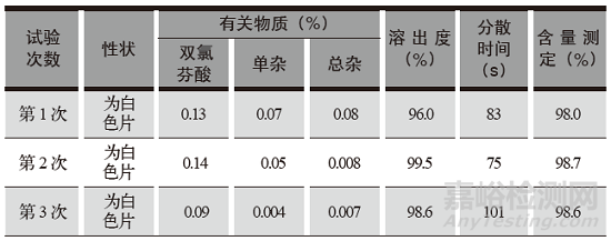 制備工藝為:將原料醋氯芬酸粉碎100目,細粉與輔料CMS-Na(內(nèi)加15%該輔料)、MCC、L-HPC、PVPP等置混合機混合10?min→加入潤濕劑(純化水適量)→混合3?min→搖擺制粒(16目)→干燥(溫度為70±5℃,時間約為2.5 h)→搖擺整粒(16目)→總混20?min(加入5%的CMS-Na?、2%的硬脂酸鎂)→壓片(沖頭Φ9?mm淺凹、轉(zhuǎn)速控制在25~30??r/min)。每次實驗1萬片,實驗3次。按《中華人民共和國藥典(2020年版)》中規(guī)定的檢驗方法進行檢驗,以顆粒的性狀、含量和分散片的性狀、鑒別、有關(guān)物質(zhì)、溶出度、分散均勻性、含量等作為綜合考察指標(biāo),進行醋氯芬酸分散片的中試工藝驗證。