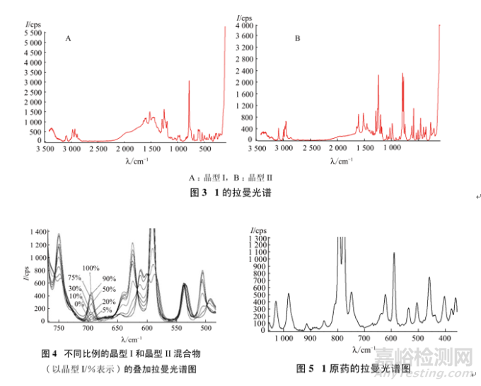 拉曼光譜法是以拉曼效應為基礎研究分子振動的一種方法,是研究分子和光相互作用發(fā)生散射光的頻率,該方法可以利用不同晶型物質(zhì)特有的分子極化率變化,引起指定波長范圍的拉曼光譜吸收峰位置、強度、峰形幾何拓撲等參數(shù)變化,從而實現(xiàn)對晶型的定性、定量鑒別。而同種化合物的不同晶型,由于其堆積方式不同會導致分子振動有所不同,故而可以用來區(qū)分多晶型物質(zhì)。拉曼光譜法和紅外光譜法均屬于振動光譜,但拉曼光譜檢測低頻振動較紅外光譜具有更明顯的優(yōu)勢,甚至可以檢測到分子的晶格振動,因此拉曼光譜在鑒別藥物的多晶型方面具有顯著的優(yōu)勢作用。該方法測定簡單,檢測樣品不需要預處理,可直接檢測,可以避免樣品處理過程中對晶型的影響。但該方法尚不成熟,暫不具權威性,一般可作為晶型定量分析的輔助分析手段。熒光干擾是拉曼光譜分析中常遇到的問題,需要通過摸索合適的曝光時間和采樣次數(shù),并且采用基線矯正,可以一定程度上減少熒光干擾。另外拉曼光譜信號絕對強度波動較大,使用同一樣品多次測量,衍射峰強度的偏差可能達到20%,因此常采用內(nèi)標法來定量分析,固體樣品可以采用樣品中某一位置的峰強作為內(nèi)標或參比,可以一定程度上提高定量結果的準確性[6]。