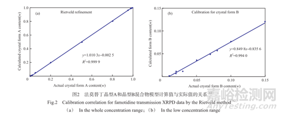 全譜擬合法:即建立全譜峰強度與被測藥物中各晶型組分的對應關系。它是以化學計量學為基礎,如偏最小二乘法、全粉末圖譜分解法、Rietveld法等方法對樣品進行定量分析,其信噪比、靈敏度和專屬性均比單峰法有明顯提高。該方法不需要提供不同晶型樣品的標樣,但是對樣品信息的要求較高,需要提供混合物中每個相的晶格參數(shù)、空間群對稱性、質(zhì)量吸收系數(shù)、原子坐標、位置占有率等參數(shù)來模擬粉末衍射圖譜,雖定量測定結果更加準確,但是方法建立和計算過程非常復雜,對樣品圖譜的解析能力要求也較高,所以實際推廣可能應用較少。如有文獻通過Rietveld法使用Fullprof軟件建立了法莫替丁晶型A和晶型B混合物的定量分析方法,該方法首先是需要結合XRPD圖譜得到一個計算模型,然后用含量為50%(w)的晶型A和晶型B的混合物對該計算模型進行修正,修正后即可用于晶型的定量分析,由結果可知計算值與實際值非常貼合,準確度很高[3]。