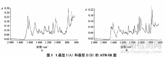 不同晶型藥物的紅外吸收光譜差異,主要表現(xiàn)在峰形變化、峰位偏移、峰強度改變等。在用紅外照射時,分子中的化學鍵或官能團可發(fā)生振動吸收,不同的化學鍵或官能團吸收頻率不同,因此在紅外光譜上將處于不同位置,從而可以獲得分子中任何化學鍵或官能團的信息。但對于多晶型樣品,由于不同晶型樣品的分子結構完全相同,因而只有在不同晶型分子間作用力發(fā)生變化或者溶劑分子介入時,才能表現(xiàn)出圖譜的差異,且該方法易受樣品中雜質(zhì)的干擾影響,其譜圖差異不及XRD圖譜差異明顯,因此一般只作為定性鑒別和輔助定量鑒別方法。在藥物的多晶型分析過程中,由于樣品在研磨過程中可能會造成藥物的晶型發(fā)生變化,因此常用石蠟糊法或擴散反射傅里葉紅外光譜法進行紅外光譜測定。例如有研究者采用衰減全反射紅外光譜法測定拉米夫定晶型Ⅱ的含量,先選擇晶型Ⅱ的定量吸收峰,由圖譜可知晶型Ⅱ在850cm-1處有明顯的吸收峰,而晶型Ⅰ在此處無干擾,因此選定該位置作為晶型Ⅱ的特征吸收峰。