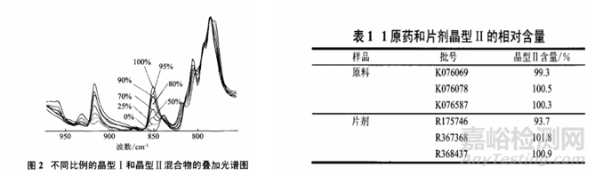 通過配置不同比例的晶型Ⅰ和晶型Ⅱ混合物樣品,將圖譜進行疊加,并在500~1000cm-1范圍內(nèi)進行滿刻度顯示,由圖知785cm-1的吸收峰為最大峰,850cm-1的吸收峰強度呈明顯的濃度依賴性,因此把785cm-1的吸收峰作為內(nèi)標峰,以定量峰和內(nèi)標峰的吸收度之比對濃度進行線性回歸,得到線性方程A850/A785=5.949*10-3C+0.00902(R=0.9935)。對不同批的原料或片劑進行紅外光譜測定,可知:原料的晶型純度均較高;而制劑樣品中有一批樣品中晶型Ⅱ的含量為93.7%[4]。
