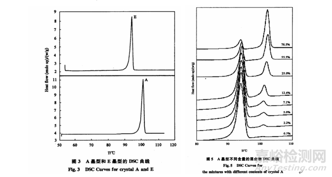 該方法是基于熱力學原理和物質(zhì)熱力學性質(zhì)而建立的分析方法。利用不同晶型物質(zhì)特有的熱力學性質(zhì),通過供試品吸熱峰或放熱峰的數(shù)量、位置、形狀、吸熱量等參數(shù)變化實現(xiàn)對晶型物質(zhì)狀態(tài)的定性、定量鑒別。該方法操作簡單,試樣用量少且樣品不需要預處理,但它僅適用于不同晶型物質(zhì)的熔融吸熱峰存在較大差異或供試品中含有不同數(shù)量和種類結晶溶劑的晶型物質(zhì)的鑒別。例如有文獻應用差示掃描量熱法定量研究阿德福韋的不同晶型,分別對A、E兩種晶型樣品進行DSC分析,結果可知兩種晶型具有明顯不同的熔點,A晶型的熔點為100℃,E晶型的熔點為93℃,兩種晶型的熔融峰可以明顯區(qū)分開,有利于利用熔融熱焓的數(shù)據(jù)對不同晶型的含量進行定量分析。分別配置含不用比例的A和E晶型的混合樣品,進行DSC測定,混合物樣品測量用量約1mg左右,混合物DSC的測試曲線結果如圖5。