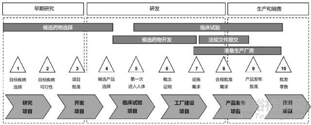 從生命周期可以看到,不同類型的項(xiàng)目就像根鏈條,串在一起將新藥品提供到市場,這些項(xiàng)目之間的各個(gè)點(diǎn)的相互影響和交付是風(fēng)險(xiǎn)的主要來源。