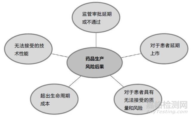 在藥品生產(chǎn)中具體的后果(見圖三)包括:無法得到監(jiān)管審批、產(chǎn)品上市推遲、產(chǎn)品質(zhì)量無法接受、未能達(dá)到技術(shù)性指標(biāo)、超過生命周期成本估算。