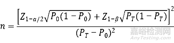 公式中,n為樣本量;Z1-α/2、Z1-β為顯著性水平和把握度的標準正態(tài)分布的分數(shù)位,P0為評價指標的臨床可接受標準,PT為試驗體外診斷試劑評價指標預期值。