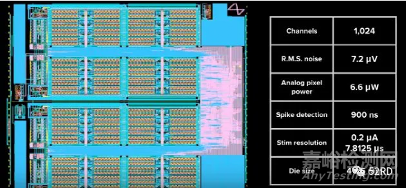 N1芯片為封裝的12個定制ASIC組成,處理3072個電極通道,一個ASIC由256個可編程放大器(Analog Pixel模擬像素)、片上ADC、控制電路組成??偣拇蠹s6mW。
