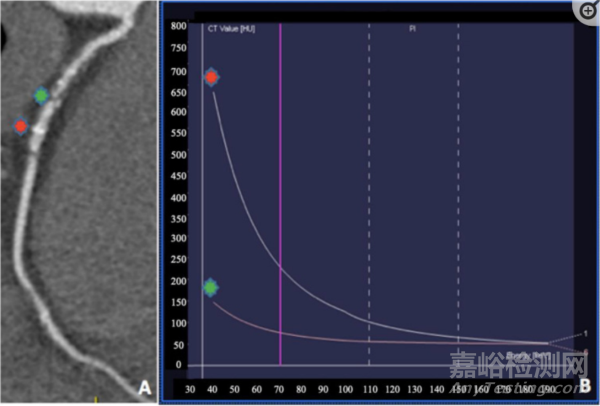 圖4:65歲胸痛男性的雙源雙能冠脈CT圖像(A) 對3維CT數(shù)據(jù)進(jìn)行多平面冠脈提取顯示75% 狹窄 (綠色星號). (B) 單能重建技術(shù)進(jìn)行斑塊分析顯示 在低keV條件下不同斑塊的區(qū)別 (紅星: 鈣化斑塊; 綠星: 纖維斑塊)。圖片直接引自文獻(xiàn)[4]